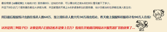 然后根据目前40个服务器的数量,计算出国服同时在线人数约为60万人左右,而且这并不包括排队的人数。