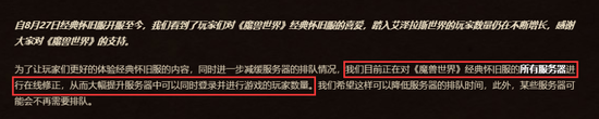 自从8月27日《魔兽世界》经典怀旧服宣布开服以来,大批玩家涌入导致长时间排队和网易不断新增服务器的新闻就不绝于耳,截止目前为止网易也宣布共增设了24组服务器以应对长时间排队的状况。