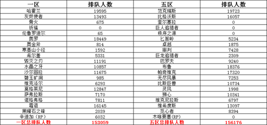 紧接着有另外一位水友统计出了各服务器晚9点的排队情况,两个大区的总和约为30万人。
