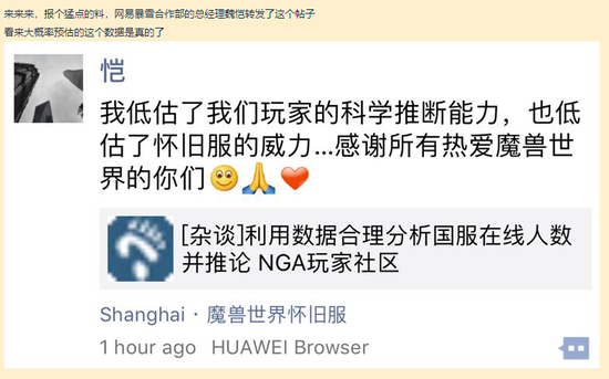 正当玩家对于这种算法是否科学和恰当进行怀疑时,再有网友曝出网易暴雪合作部总经理也看到了这个帖子并转发到了自己的朋友圈,并配文:“我低估了我们玩家的科学推断能力,也低估了怀旧服的威力”,说明可能连官方都没有预料到怀旧服的上线会如此受到欢迎。
