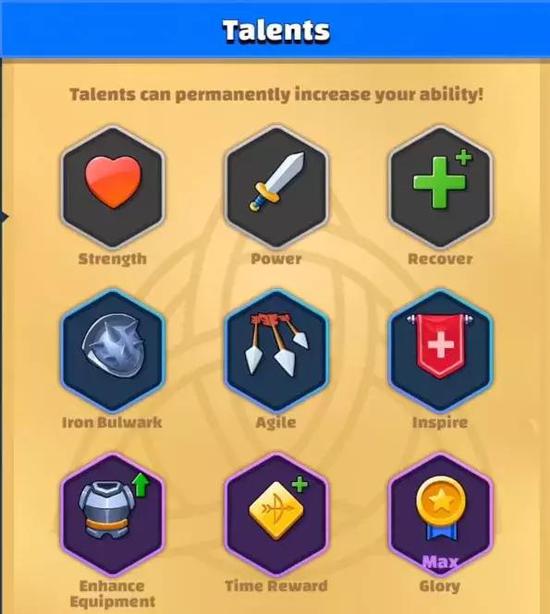 游戏的后期难度较高,在休闲游戏里,通过升级的方式解决是最常见的解决方案,模拟游戏则会给你更多的金币和建筑、《皇室战争》则提高塔防属性。《弓箭传说》里的系统则没有这方面的设计:玩家必须刷图获得经验,然后买天赋,但并不能带来比较明显的结果。