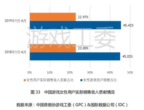 游戏工委发布的《2019年1-6月中国游戏产业报告》显示,2019年1-6月,中国游戏女性用户达2.93亿人,占整体用户规模的45.42%;女性用户贡献的市场实际销售收入为260.8亿元,占整体游戏市场收入的22.97%。