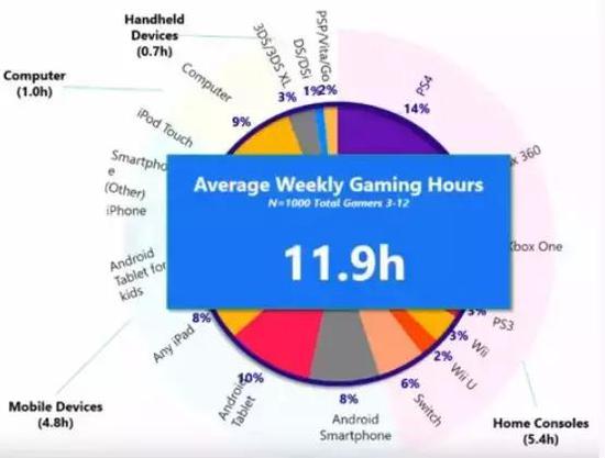 5、游戏真的是他们生活的一部分。调查显示,他们平均每周的游戏时长近12个小时,移动和家用主机是最为重要的两大游戏娱乐设备,前者占了4.8小时,后者占5.4个小时。根据他们过去7年的调查,这个数据在逐年上涨,前几年是8-9个小时,这说明游戏占孩子的生活比重在加大。