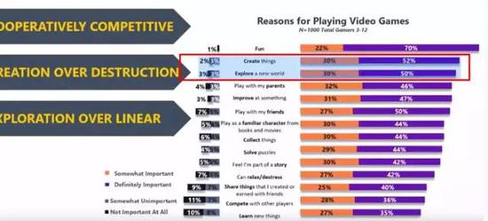 Divnich提到另一个有趣的现象,如果两款游戏,一款需要很多时间,一款属于快进快出,46%的小孩会选择前者,他们希望能在游戏中投入很多的时间,比如《我的世界》,就是《堡垒之夜》也朝着《我的世界》的方向发展,这跟成人有明显区别,成人中有超过7成选择是快进快出的游戏。