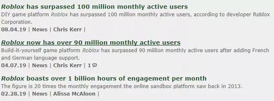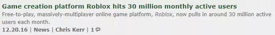 2016年12月,游戏创作平台Roblox的月活达到3000万。新闻提到,Roblox对社交以及合作体验的关注,推动了平台的发展。他们把自身定义为新兴游戏的启动平台。当时,该平台的UGC游戏超过1500万个,其顶级内容创作者每月收入超过5万美元。
