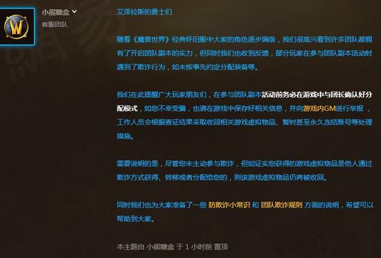 随着《魔兽世界》经典怀旧服中大家的角色逐步满级,我们很高兴看到许多团队都拥有了开启团队副本的实力,但同时我们也收到反馈,部分玩家在参与团队副本活动时遇到了欺诈行为,如未按事先约定分配装备等。