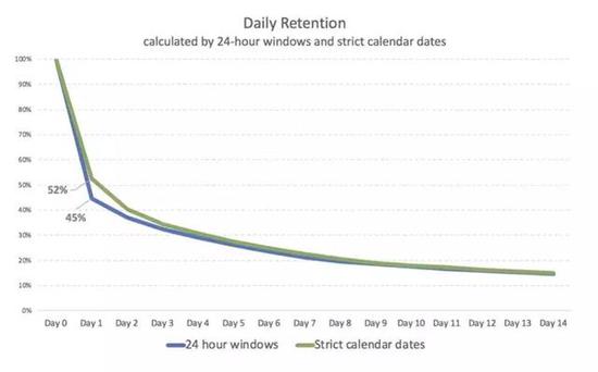 这里有个案例可以展示,不同的计算方式带来的差别有多大。下图可以看到不同计算方式的留存率,在某些节点,如果按天数计算,次日留存率为52%,而如果按照24小时制,则只有45%,两者之间的差别还是很明显的。