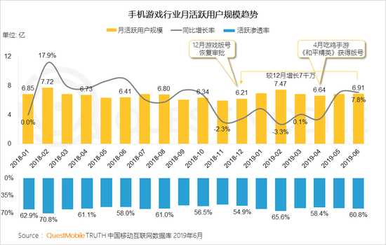 1.2019年上半年整个国内手游市场大盘仍在持续回暖,6月份手游收入同比增长21.5%,而月活跃用户规模也达到了6.91亿。