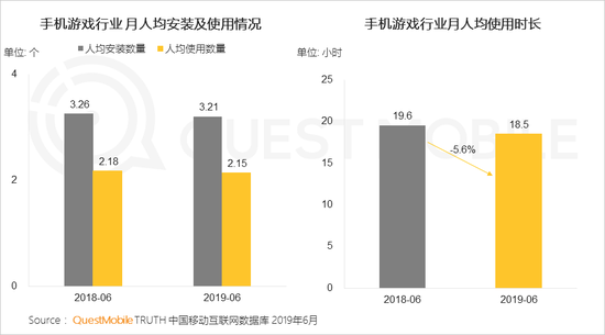 不过,手游行业的月人均安装数量、使用数量以及用户游戏时长都出现了明显的下跌。数据显示,今年6月份的手游行业月人均使用时长为18.5个小时,同比下滑5.6%,也就是说玩家平均游戏时间较上年减少了1小时。
