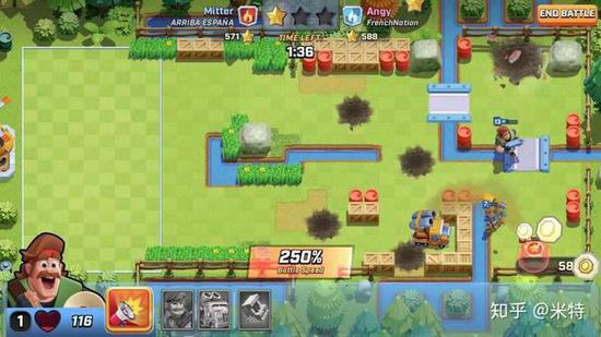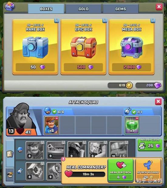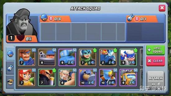 战斗和海岛奇兵(Boom Beach)比较像,士兵的策略主要是搭配策略,有限制的战前和战中投放策略,道具的策略主要是战中投放的时机和位置策略