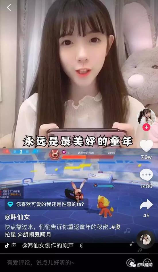 抖音上,网红韩仙女分别表演了10岁、15岁、成年后玩《奥拉星》的三种状态,循序渐进地代入品牌——“奥拉星永远是最美好的童年”,这句台词配合韩仙女的人设,最终使视频获赞7.9万。