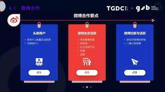对于微博来说,游戏运营主要看三个方面,第一微博是个强关注的平台,对于头部用户的关注度较高,他们的KPL就是头部用户新增了多少、发声增加了多少就很重要,所以可以通过与头部用户的联合活动向微博申请资源;第二个是游戏生态活跃,就会关注电竞直播、短视频、社交定制产品、热搜话题等;第三块是微博的拉新与活跃,中小游戏可以通过游戏端和微博的直接拉起展开合作。