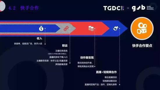对于快手来说,今年7月份才针对游戏领域做了首次PR,快手今年收入要达到300亿,日活用户要到3个亿,对收入、游戏联运的需求比较高;还有创作者的变现,快手也在发力扶持优质创作者并帮助他们商业化,这也是我们目前和他们合作的重点之一;另外是目前跑的比较成熟的直播加短视频的方式,这里就不详细赘述了。