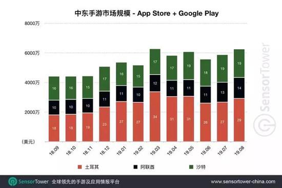 Sensor Tower 数据显示,过去一年土耳其,阿联酋和沙特手游市场仍处于快速发展阶段。2019年8月三个市场手游总收入达到6200万美元,较2018年9月4400万美元上涨40.9%。