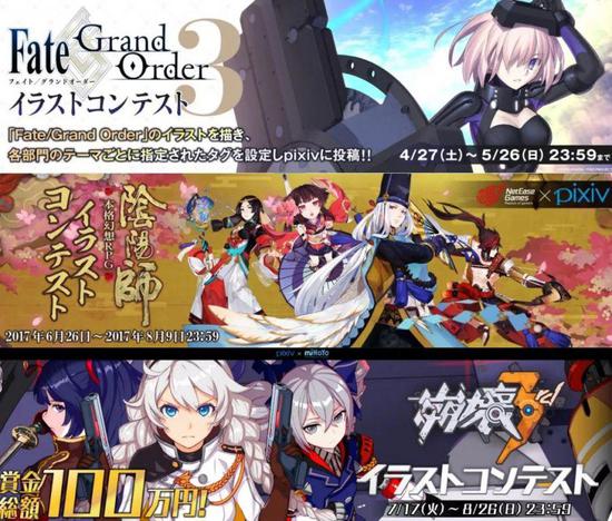 以日本最大的同人插画交流站Pixiv上的数据来说,文中我们提到的《阴阳师》、《FGO》、《崩坏3》均在上面举行过多次同仁内容创作比赛,除此之外,《碧蓝航线》、《少女前线》、《机动战队》、《奇迹暖暖》等国产游戏也曾在P站上举办过插画大赛,也都收获了不错的成绩。
