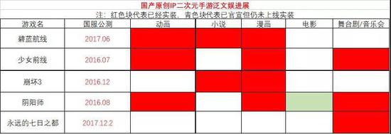 在这种大背景下,《阴阳师》将目光放在了IP上。和《FGO》有些类似,但不同的是,《阴阳师》更加注重在泛娱乐的布局,基于游戏内社交的优势,在挖掘潜在用户方面做的更加绝。二次元游戏的泛娱乐布局是《阴阳师》长线运营的关键,我们统计了几款国产二次元游戏在泛娱乐方面的布局,得出了下面这张表格: