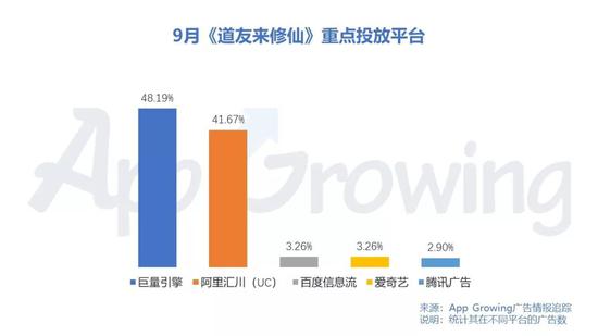 1。 仙侠游戏投放强势,5款入榜新投放TOP20在本月“新投放”手游推广排行榜TOP20中,仙侠风格游戏占比最多,共5款。投放金额较高的《道友来修仙》、《这个道友很危险》均为放置题材的修仙手游,而《仙剑破解版》、《将夜纪》、《仙道伏妖传》均为修仙题材RPG手游。2。 榜首《道友来修仙》广告创意分析1)巨量引擎&阿里汇川(UC)为重点投放平台《道友来修仙》在9月重点投放巨量引擎、阿里汇川(UC),近9成广告数都分布在这两大平台,在百度信息流、爱奇艺、腾讯广告投放量级较小。
