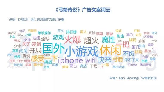 2)广告文案突出休闲单机手游优势从该游戏的广告文案词云图我们也可以看出,《弓箭传说》在文案方面主要以“休闲”、“小游戏”、“国外”、“iphone”、“wifi”为吸引点,突出自身休闲单机游戏的优势。