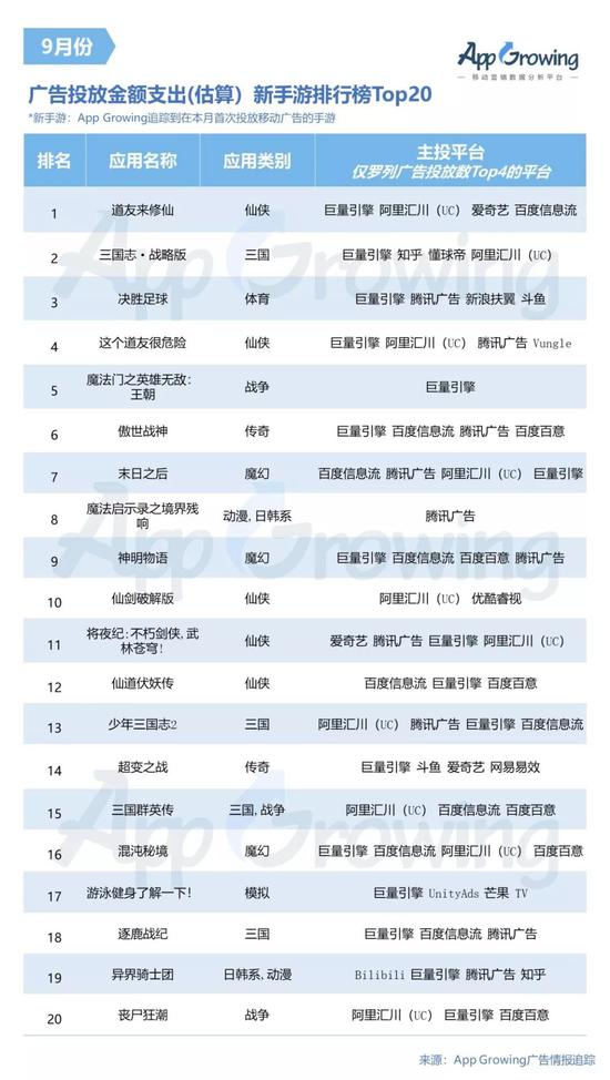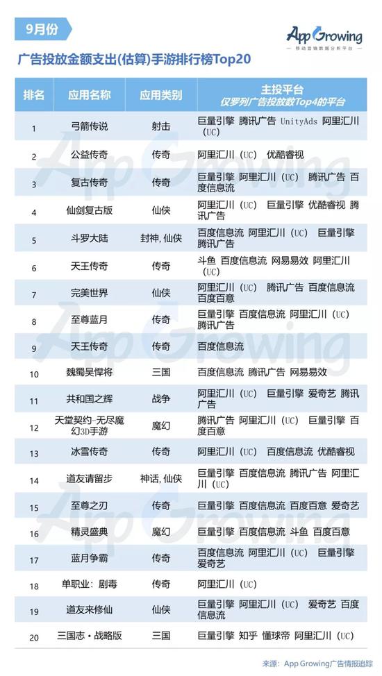 其中9款传奇类手游上榜广告投放总金额(估算)手游排行榜Top 20,《弓箭传说》强势领先,位居榜首。多款仙侠类手游在9月强势推广,《道友来修仙》位列新投放手游Top 20排行榜第一。