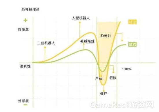 再回到刚才的遗留问题,从上文中我们可以看到,在人们面对不同程度的虚拟现实时,会有不同的反应。最早是玩具、广告中的老虎、儿童乐园里能动的机器鳄鱼,我们一眼就能看出它是假的,所以我们对它熟视无睹。后来是打电话、看电视、玩电脑、听广播,它们已经成为了我们生活于其中的领域。绝大多数情况下,它对我们来说就是真实的,我们并不在乎它的真假,因为我们可以轻易的进入和离开。在这样的过程中,我们可以看到一条明显的趋势:这是一个逐渐富感官化而弱能动性想象力的过程。最早只给了我们一个模仿拙略的图像或模型,我们想象其故事并沉入其中。后来是给了我们除却视觉还有听觉,甚至有些已经有了故事的世界让我们沉入其中。而在这个过程中,能够成为创造虚拟现实的载体,也越来越多。那么这里就带来了一个问题和两个结果。一个问题是,按照这样富感官化的过程,最终达到100%程度的虚拟现实,有什么后果?说到这里,我们又要搬出日本机器人专家森昌弘的“恐怖谷理论”。简单来说,当机器人与人相像超过95%时,由于相似,人类会对机器人产生正面的情感。但继续增加下去,达到一个临界点时,这种好感度会突然降低,导致越像人,人类越会觉得恐惧。这也是为什么,有些逼真的洋娃娃会让人觉得害怕。那对于完全仿真于真实世界的100%虚拟现实而言,或许是一样的感受。