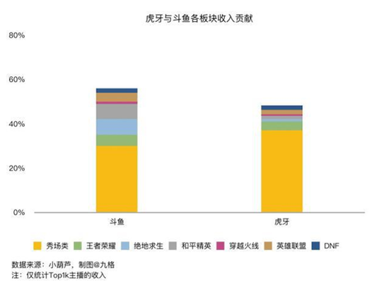 虽然两家都标榜自己是游戏直播平台,但通过财报数据仍能发现,他们的收入仍然是秀场占大头,而斗鱼和虎牙近年来也一直在秀场的基础上拓展自身泛娱乐的“疆土”。