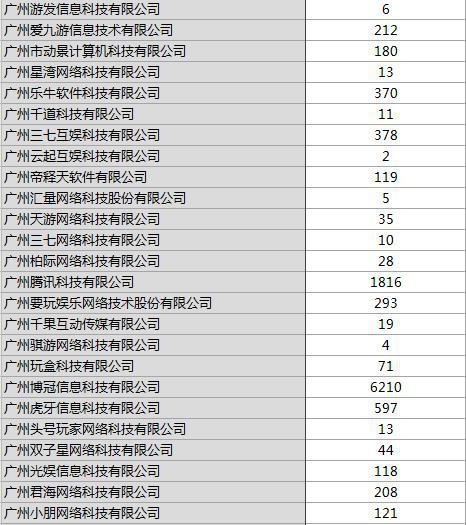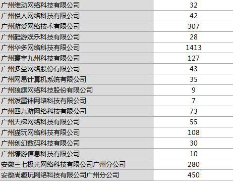 它们分别为:安徽尚趣玩网络广州分公司、安徽三七极光网络广州分公司、广州猫玩网络、广州寰宇九州科技、广州华多网络、广州游爱网络、广州小朋网络科技、广州君海网络、广州光娱信息、广州虎牙信息、广州要玩娱乐网络、广州博冠信息、广州腾讯科技、广州帝释天软件、广州三七互娱科技、广州乐牛软件、广州市动景计算机、广州深海软件、广东趣炫网络、广州谷得网络、广州四三九九、广州泰逢信息、广州银汉科技、广州诗悦网络、广州卓动信息、火烈鸟网络(广州)股份、广州市漫灵软件、广州明朝互动、广州简乐网络、广州西山居世游、广州泳泳信息、江苏嘉趣网络广州分公司、浙江星飞信息广州分公司、上海伶狐网络广州分公司、上海歆瑷网络广州分公司、海南元游信息广州分公司、上海彬捷网络广州分公司、上海弘贯网络广州分公司、上海菲狐网络广州分公司、上海戏幻网络广州分公司、上海翼殿信息广州分公司、上海暗沙网络广州分公司、广州麦驰网络等。