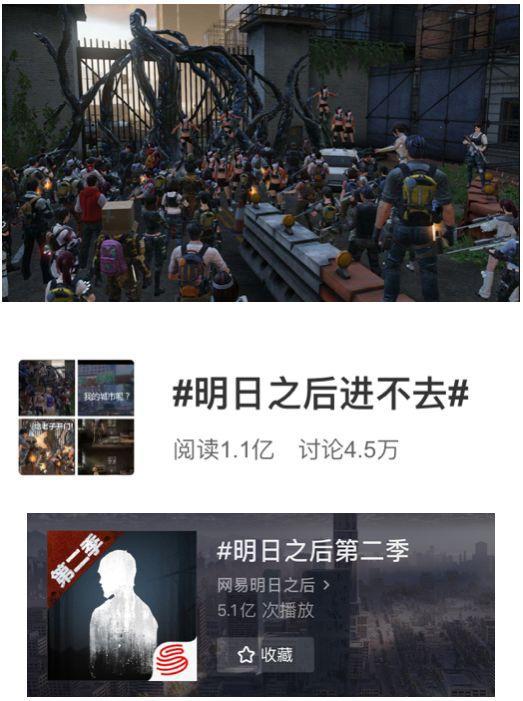 而且在更新之后,大量玩家一度盘踞在游戏中“莱文市”的城门口,微博上还因此出现了一个话题:#明日之后进不去#,它的阅读量已经超过了1亿;抖音#明日之后第二季#话题的播放量更是超过5亿。