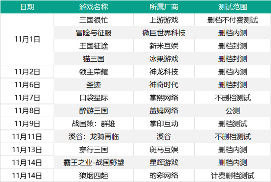而在11月开测的游戏列表中,我们也看到不少SLG的身影。统计11月目前为止的开测表,当中就有包括星辉游戏《霸王之业-战国野望》在内等13款SLG手游进行测试,平均一天一款的节奏,可见目前仍有非常多的厂商在持续跟进这一品类。