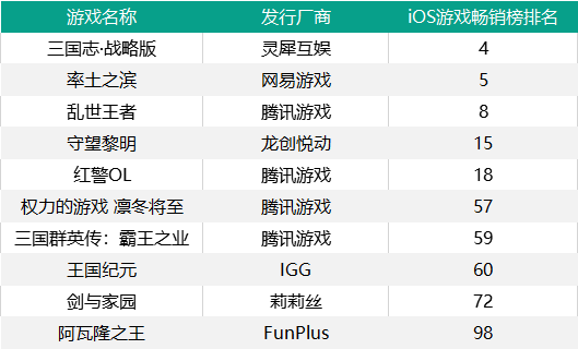 打入TOP20的头部产品之外,还有5款SLG入围iOS游戏畅销榜TOP100,分别是《权力的游戏 凛冬将至》《三国群英传》《王国纪元》《剑与家园》和《阿瓦隆之王》。整体而言,打入TOP100的这些SLG产品大部分都为“老游戏”,只有近期爆款《三国志·战略版》和“出海转内销”的《守望黎明》为今年新上线的产品。从厂商角度来看,打入TOP100的10款SLG产品中,有4款出自腾讯。