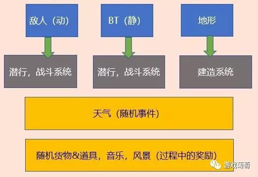 3。 短中长期的节奏变化:具体到玩家的每一段行动过程,游戏准备了额外惊喜作为奖励。玩家会在路途中发现随机货物&道具,精心设计的风景,音乐。中期随着每次玩家完成任务推动进程,他们还能不断地获得对抗人类敌人,BT和环境的新工具。长期的变化主要由环境变化来实现,天气预报,阵雨,时间雪,毒气等新环境因素不断加入,可以起到有节奏地打乱和升级玩家现有的游戏策略。
