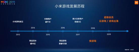 在过去的6年里,小米游戏一直坚持我们自己的使命,就是坚持为玩家提供优秀的游戏作品和服务内容。小米游戏从创建到现在,6年时间里,我们也的确取得了很不错的一些成绩:2013年小米游戏成立,2014年我们的联运流水破十亿,2015年付费用户破千万,2016年我们在线联运的游戏超过一万款,2017年我们累积的注册用户破两亿。