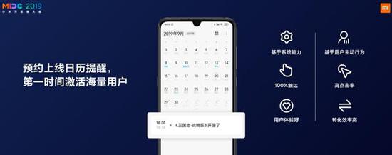 除了个性化预约页面,我们还为开发者提供了系统级的支持。我们近期尝试在MIUI的系统日历里开放游戏开服和上线的提醒能力。简单来讲,就是基于用户之前的主动预约行为,在游戏上线的时间点,我们会通过系统日历的提醒,而这个提醒又不会伤害用户体验,可以做到百分之百的一个用户触达。据测试,这个功能的效果要明显好于传统的push和短信渠道。