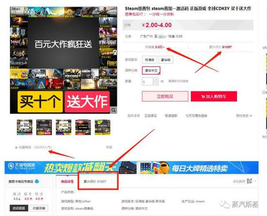 也就是淘宝购买的Steam慈善包!或者叫做游戏包!也就是玩家花少量的钱购买一些随机的CDKey来激活游戏!最常见的卖家操作是买10个给好评送高价大作!首先这10款游戏绝对是玩家都不会正常情况下购买的!基本体量很少有超过百兆的游戏!其次是送的那款大作!是跟某工作室签订的!也就是标价68元起步的一款垃圾游戏!(插句题外话,定价在38元是小型开发室游戏最稳的价格思路,反正也没指望走量,活动的时候打骨折就好了。)