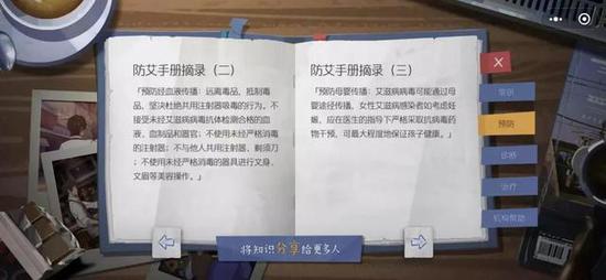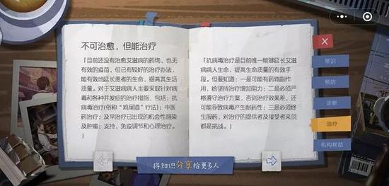 这也使得《蓝桥咖啡馆》能够呈现出科学严谨、却又不失真实温情的内容,通过代表艾滋病阻断药物的蓝色、代表沟通的桥梁设计了一个小小的、充满人情味的咖啡馆。随着游戏叙事的展开,玩家不会面临枯燥的填鸭和说教,而是看到一个个生活在我们身边的普通人,以及他们身上所发生的不普通的故事。借助情感上的共鸣,激发玩家自发去了解防艾、关注防艾。除此之外,在游戏的“店长手册”中,玩家还可以查阅到有关于艾滋病的知识科普,包括传播途径、监测机构,以及暴露后预防、治疗措施等等。