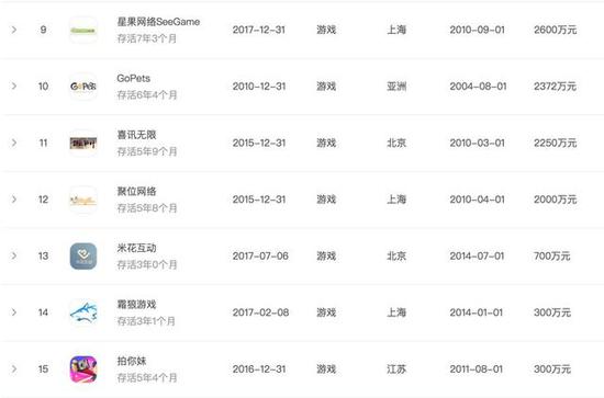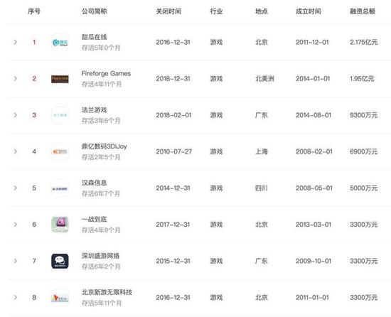 死亡游戏公司——存活最久的5家公司最短命的是成都北冥鱼游戏,去年5月份才成立的公司,在今年6月份已经终结。据了解这是一家由国内一线大厂的辞职员工创立的H5游戏研发公司。目前搜索不到这家公司的产品信息。