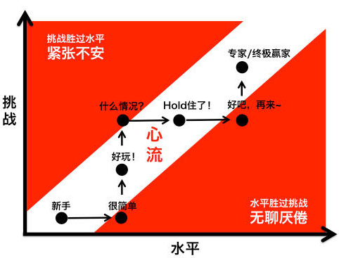 所谓心流体验,说起来主要就是:制造障碍,玩家通过现有手段刚好克服这个障碍,然而游戏再给予玩家奖励,随后抛出更难但符合提升能力后的玩家的障碍。