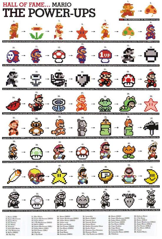 以游戏中的强化道具为例,最初在 FC 上的《超级马力欧兄弟》,就只有最经典的超级蘑菇、火之花和无敌星这寥寥几种强化道具。而随着新作推出,马力欧总能获得新的强化道具。