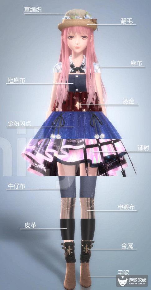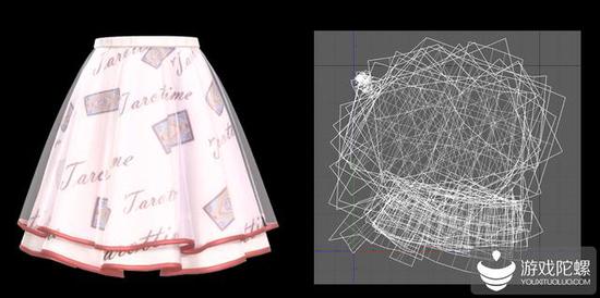 这是游戏中一款裙子的效果,大家仔细看上面的花纹,并不是tiling的效果,是有一定的随机变化的,上面的花纹我们是通过UV进行拼接的,大家可以看一下这个裙子的UV,非常的复杂凌乱,但是这样才能得到我们想要的效果。