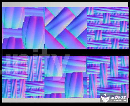 然后这是一个简单的组合方式,我们会先制作一个基础的编制效果,然后再增加一些随机变化,比如像布料使用久了会有地方被磨损,最后我们加一些细节,这里我增加的编织物上面的线头,这几个是完成的纹理的渲染效果。