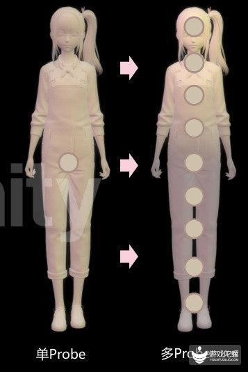 后面我们的解决思路是沿着球的纵向进行摆放LightProbe的采样点,点的密度可以进行调整,如果希望面部光照更丰富的话,就可以在面部摆放得密集点。最后我们会把所有的信息都烘焙到这些LightProbe球上,这样我们就可以得到一个光照很丰富的效果了,而且成本也不会很高。