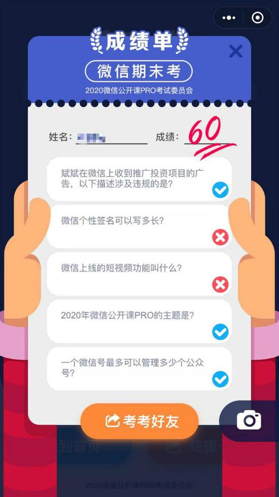 在5轮问题后,玩家将会收到微信公开课PRO考试委员会发布的积分排名,以及一份“成绩单”。