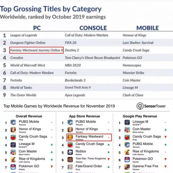 根据此前SuperData Research公布的2019年10月份全球游戏市场游戏收入榜,《梦幻西游》电脑端位列第三名。在Sensor Tower 公布的11月全球手机游戏营收排名榜中,《梦幻西游手机版》也处在App Store收入榜第三名。