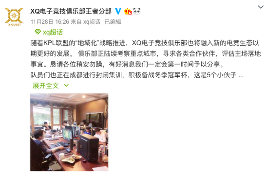也是在这一天,XQ战队在微博上表示“将融入新的电竞生态,陆续考察重点城市、寻求各类合作伙伴”等,暗指有动作发生。