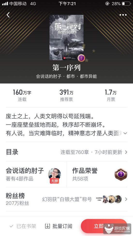 由《大王饶命》作者会说话的肘子所撰写的《第一序列》,则可以说是2019年最受瞩目的科幻求生网文之一。从今年4月连载至今全网阅读量已突破千万,在起点读书APP上长居各大榜单前列,于QQ阅读上也收获了百万赞赏。