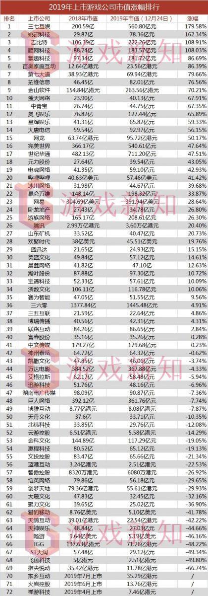 近日,游戏新知统计了一下72家游戏上市(不含新三板上市)公司2018年和2019年的市值。有的公司在高位仍实现了几近翻倍的增长,有的公司则在连续亏损中耗尽了股民的耐性,市值跌没了90%。