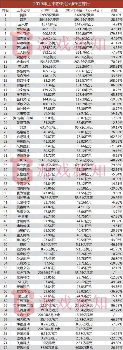 总体来说,相比2018年,72家游戏公司的总市值涨了21%。其中腾讯市值为3.6万亿港元,吊打剩余71家游戏公司的总市值还绰绰有余(1个腾讯≈71家游戏公司总市值*2.8,在货币换算时1美元=6.999RMB、1港元=0.9RMB)。