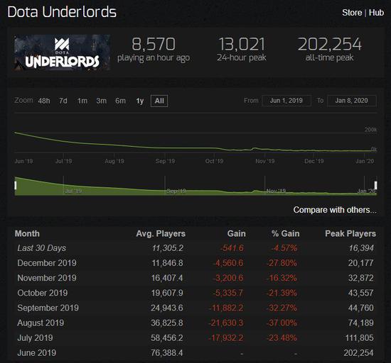 从 SteamCharts 的数据图表来看,《刀塔霸业》自去年 6 月创下 20 万峰值在线人数的佳绩后,玩家就一直在不断流失。本作近 30 天的峰值在线人数已经跌至 16000 出头了,而 24 小时峰值在线人数只有 13021。
