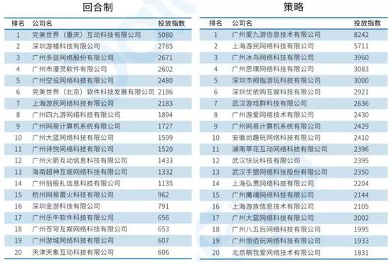 回合制和策略类整体投放指数较弱,两者第1名为完美世界(重庆)和爱九游,投放指数分别为5080和8242。广州网易同时上榜这两个品类,投放指数在2000上下。