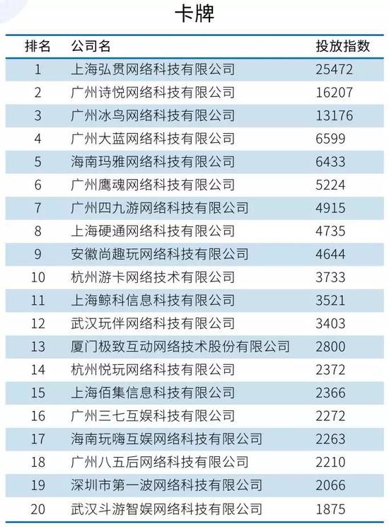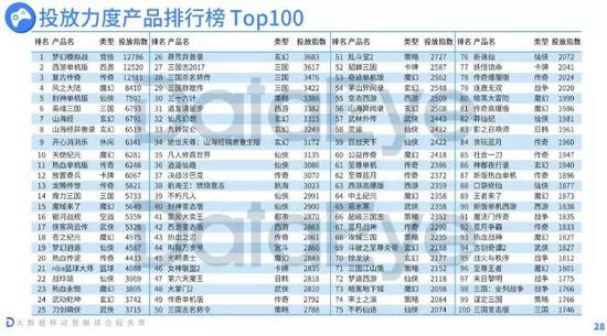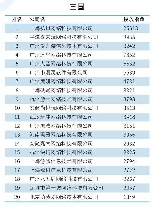 三国类马太效应更加明显,弘贯网络一骑绝尘,投放指数25613;游族排名第16,投放指数2794。