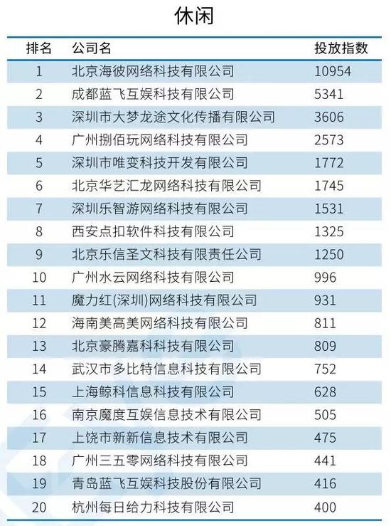 休闲类在整体玩法品类中投放强度中等。海彼网络和蓝飞互娱分居前两名,投放指数为10954和5341;多比特也榜上有名,排名第14,投放指数752。